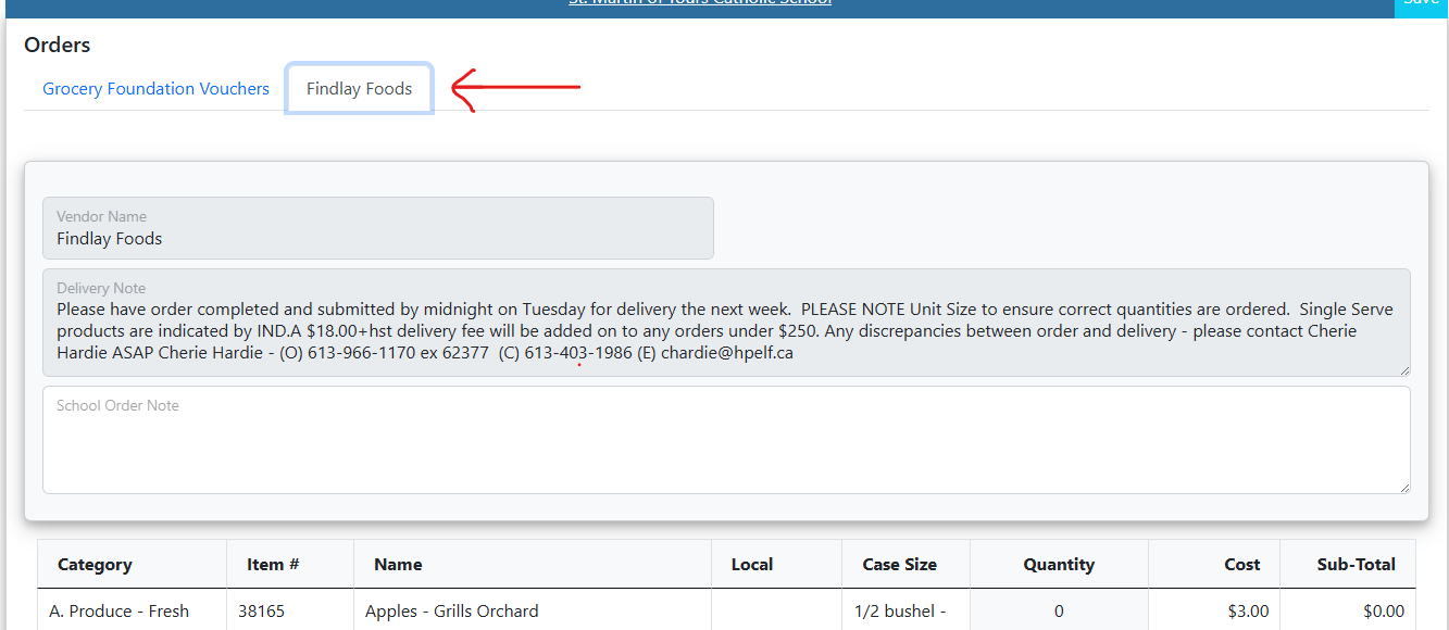 This will take you to the order form. Some schools will have 2 tabs showing Grocery Foundation Voucher and Findlay Food option tab. To place your order from our “Hub”, please select the Findlay Foods tab.
