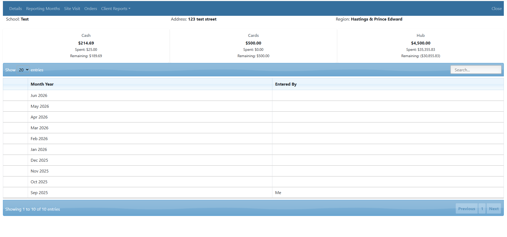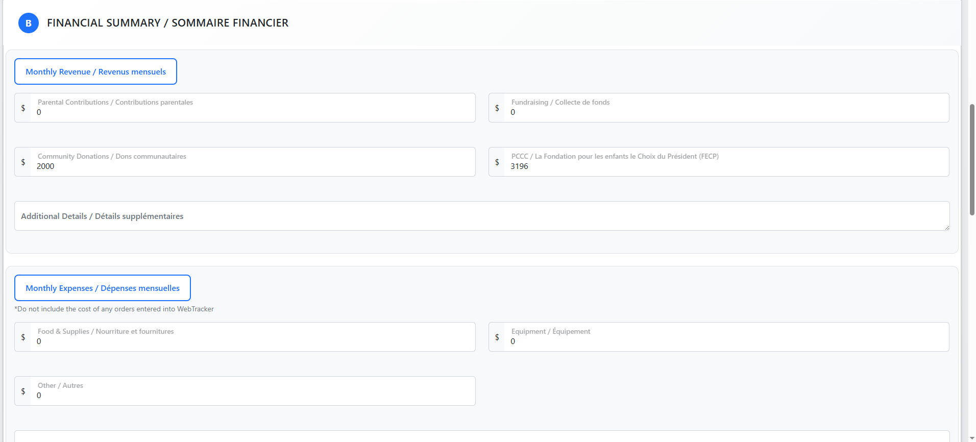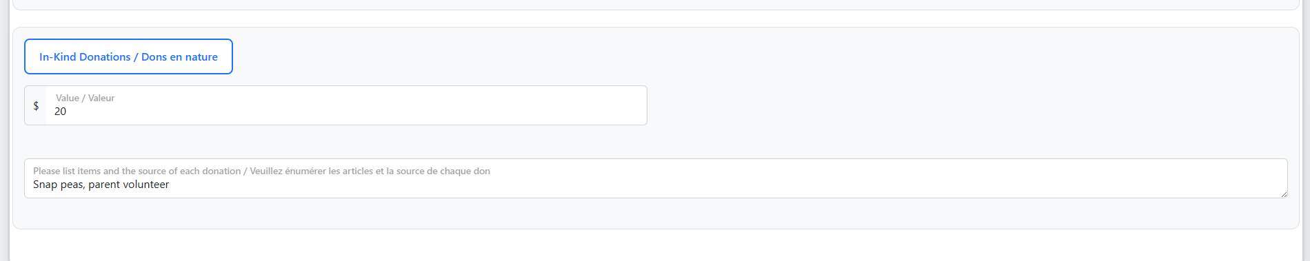 In Kind refers to non-cash contributions that support the program. Report the estimated dollar value of these contributions to show the full community support for the program. For example, if a parent donated food or supplies. Please be sure to indicate where the donatios came from and what items were donated. Any food items that you receive by or through Food for Learning will be entered into Webtracker for you. Please DO NOT enter these items in your Monthly Report (such as donated milk from Reid’s or the yogurt donated by Breakfast Club of Canada). You can see a list of what has been entered by checking your Client Report (see #3 above for instructions).