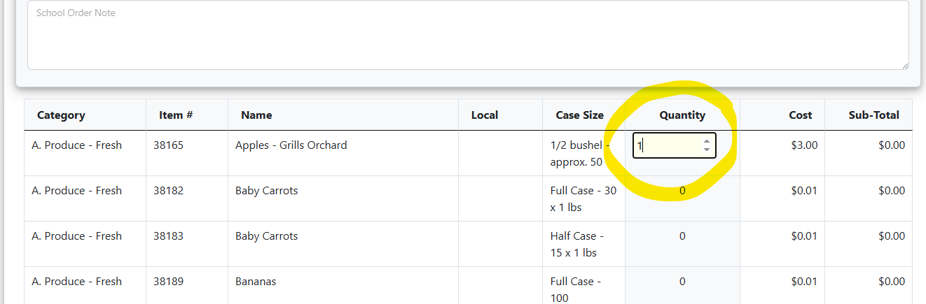 Below the school information, you will see an extensive grocery list organized by food group, with non-food consumable supplies at the bottom. You will enter, under QUANTITY, how many of each item you will require that week (click on the cell under Quantity and use the arrow to add how many you want of that item). Please pay close attention to case size to help you with your volume. For example, if you enter 2 under quantity of Apples – Grills Orchards you will be receiving approximately 100 apples (NOT 2 apples) – as the description notes , this case size is ½ bushel which is approximately 50 apples.
