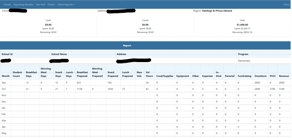 Along the top, under your school’s information, you will find financial information related to funding provided by Food for Learning. You may receive financial support from Food for Learning, and our partners, in three ways: