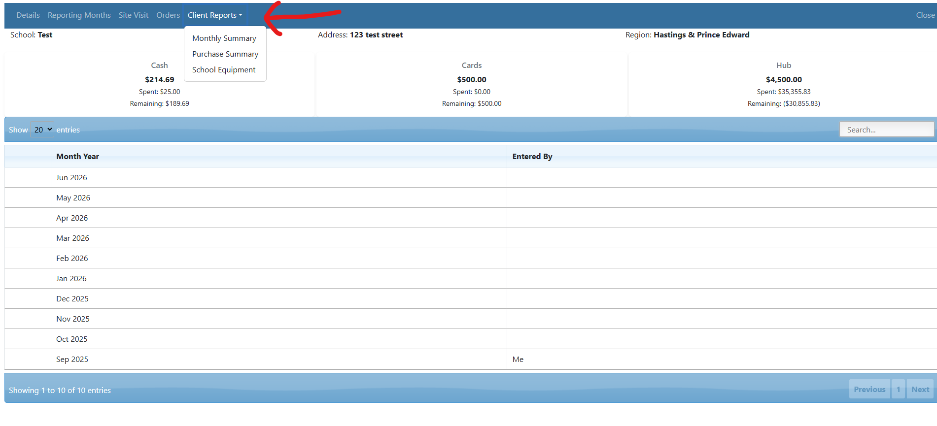 - To see a list of payments entered by Food for Learning staff, click on the Client Reports tab in Webtracker and choose Montly Summary button. Here you will see three grouping of information.