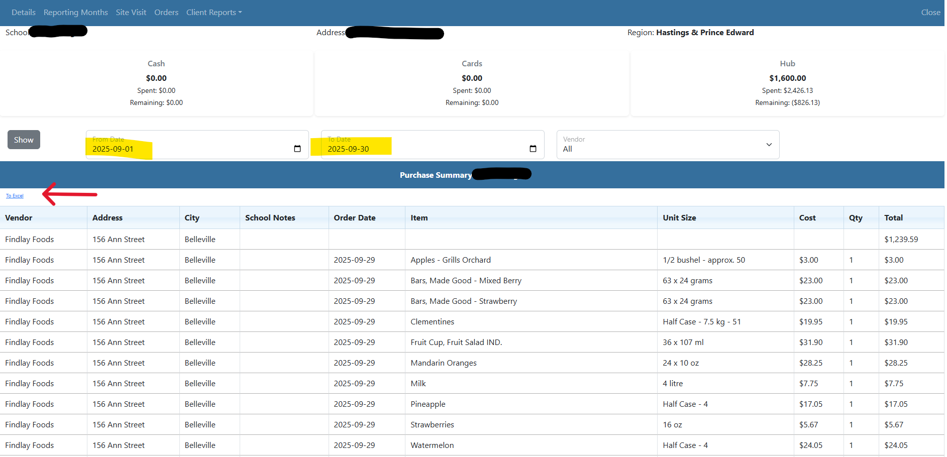 The second section, Purchase Summary will show you a report of the total amount your programs have spent on food orders, if you receive food from our food “hub”. You will need to select a date range, and you can view all purchases or select one vendor. You can export these reports to and excel spreadsheet, by clicking To Excel.