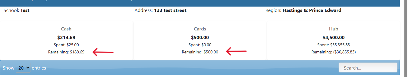 The cash and card balances are the amount of receipts that are still outstanding that need to be submitted to show that the grant/money provided has been spent.