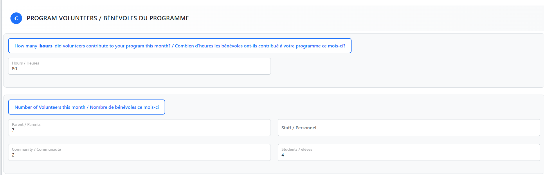 There was some confusion with reporting volunteer numbers in the past, so we’ve changed it up this year and ask that you report the total number of volunteers each month, including parents, staff, community, students.